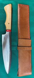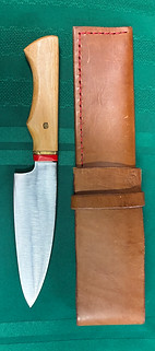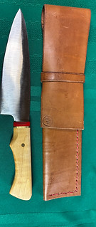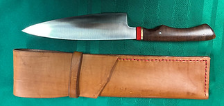 My signature look for the Chef Knife is a 1/4 inch Red G10 bolster a 1/8 inch brass spacer and usually a mosaic brass pin. All handles are shaped and finished by hand. The handle material is always harvested locally in the Catskill region of NY. Black Walnut and Maple have been my go to.
