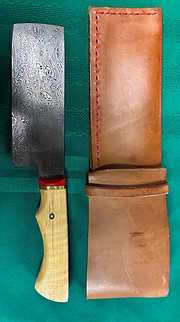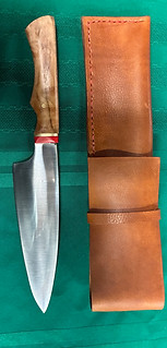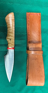 7 inch high carbon steal blade with full leaf curly maple handle, G10 bolster, brass spacer and mosaic pin